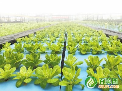 明亮寬敞的玻璃溫室里,十幾個(gè)長(zhǎng)方形水池一字排開,水池里漂浮著藍(lán)色泡沫板。泡沫板上,均勻地分布著18個(gè)乒乓球大的圓孔。一棵棵生菜從圓孔里綻放出嫩嫩的綠芽,乍一看,好似漂浮在水面上……