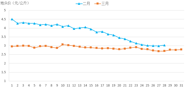 一是平均地頭價走勢企穩(wěn)。受春節(jié)后消費需求下降、氣溫回升蔬菜產(chǎn)品供應(yīng)量增加、種植面積同比增加等因素影響,2月份全國蔬菜平均地頭價出現(xiàn)明顯下降,從月初的4.51元/公斤降至月末的3.03元/公斤,降幅32.8%。3月份,全國蔬菜生產(chǎn)進入冬春蔬菜與夏季蔬菜倒茬季節(jié),加之3月上中旬低溫陰雨天氣影響了長江中下游等地區(qū)蔬菜生產(chǎn)和采收,供應(yīng)量有所下降,平抑了地頭價快速下滑的勢頭。3月31日,全國蔬菜平均地頭價2.78元/公斤,比3月1日的2.96元/公斤下降6.08%。